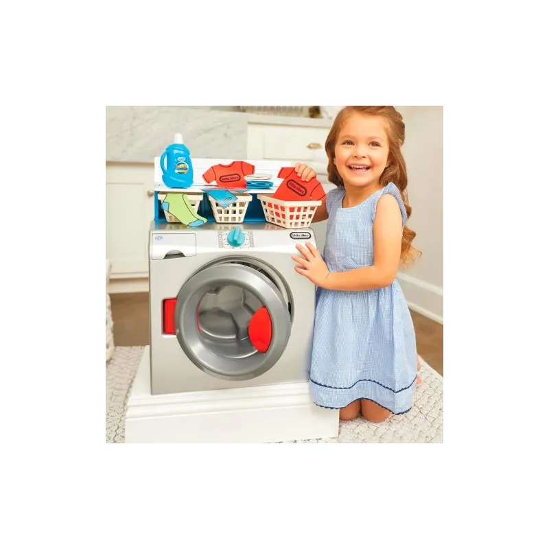 EDAD +3 AÑOS Mi primera lavadora secadora de Little Tikes es un juguete interactivo diseñado para ser lo más realista posible y que los niños puedan jugar. Esta lavadora secadora interactiva de juguete está diseñada para que los niños puedan simular que están lavando la ropa. Gira el dial para activar el tambor giratorio y observa cómo realiza un ciclo de lavado/secado. Los niños pueden llenar el dispensador de detergente con la botella de juguete, elegir entre diferentes ciclos, doblar la ropa en la mesa superior y clasificar la ropa en las cestas o debajo de la mesa. Esta lavadora-secadora está repleta de sonidos realistas: giro del dial, sonidos de tambor giratorio, pitidos, cambio de ciclo y más.